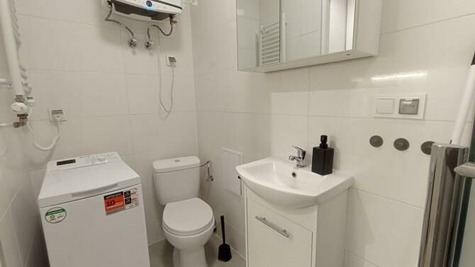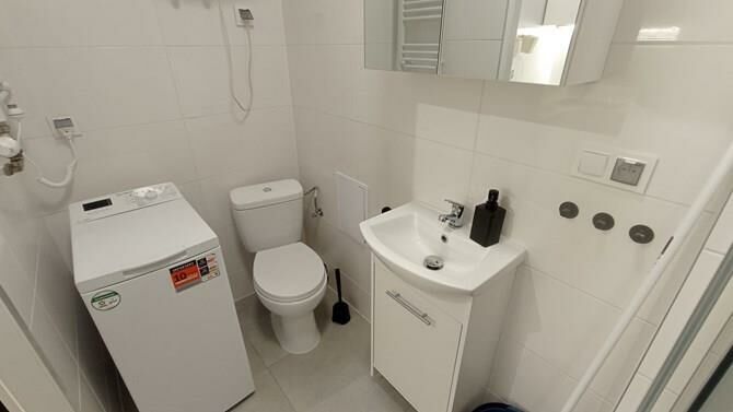 Łazienka z WC: kabina prysznicowa, szafka, lustro, pralka