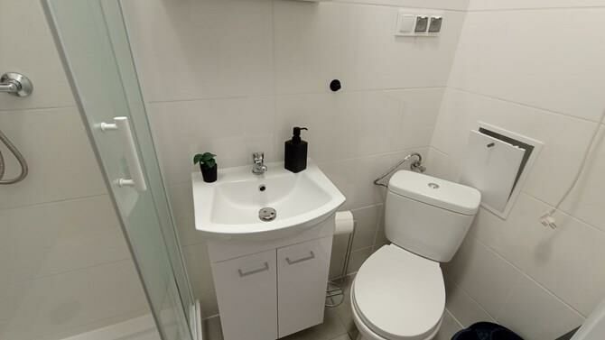 łazienka z WC: kabina prysznicowa, umywalka, szafka